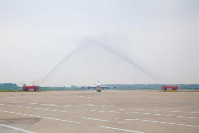 2018年5月18日,由韓國仁川至江蘇無錫再至德國哈恩的5Y523/524航班緩緩落地,通過“水門”迎接。